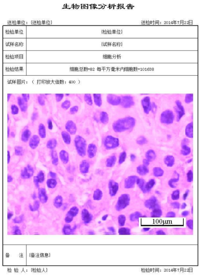1、细胞分析:对深色或浅色细胞自动统计细胞总数,每平方毫米内细胞数,单个细胞的直径及面积。