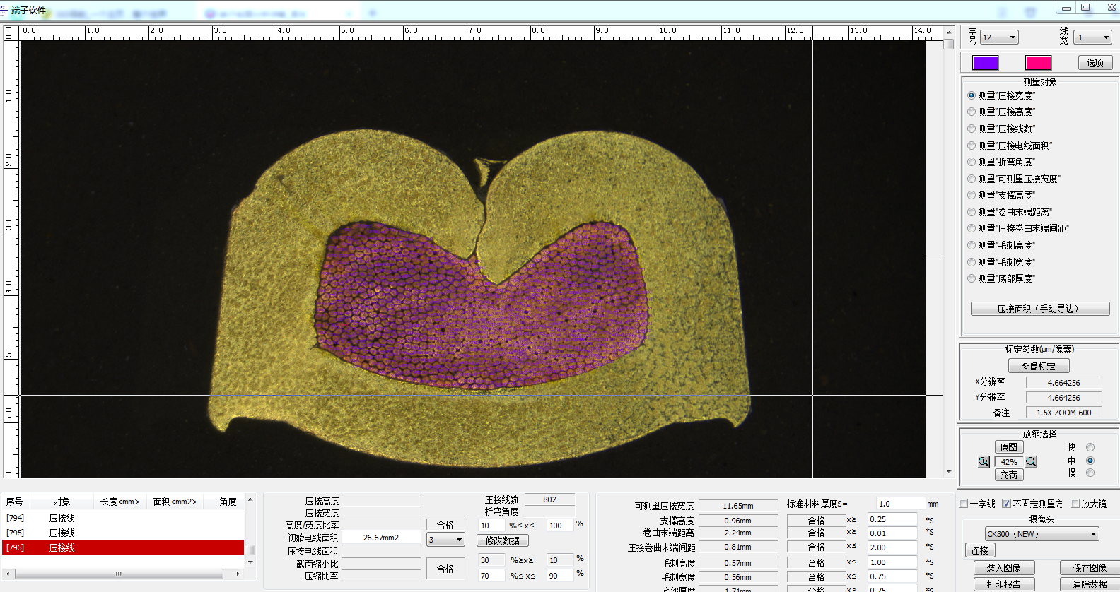 DZ-3000端子分析软件分析原理是:将制作好的压线端子截面分析样品放置于显微镜下,通过显微镜放大图像后在电脑实时显示出来,再由软件测出端子相关数据,最终由软件生成一份专业分析报告文档。